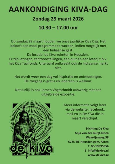 Op zondag 29 maart staan we weer met een kraampje met informatie, merchandise, en diverse native arts & crafts op de Kiva dag in Heusden (gemeente Asten), bij onze zusterstichting de Kiva.